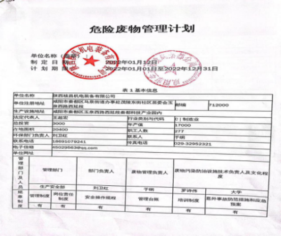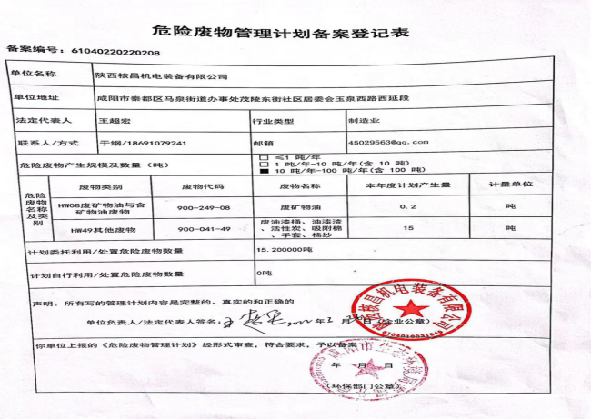 我公司屬機電一體化、機械加工等產(chǎn)業(yè)的生產(chǎn)及經(jīng)營活動, 現(xiàn)階段主要的危險廢物包括:油漆桶、廢機油、乳化液、噴漆、噴砂。油漆桶、廢機油、乳化液等危險廢物處置由陜西明瑞資源再生有限公司承接轉(zhuǎn)運及處理危廢;噴漆、噴砂房等由公司投入大量資金進行升級改造,在經(jīng)營活動中加強職工環(huán)保培訓,不斷提升職工環(huán)保意識。經(jīng)陜西格林秦灃環(huán)??萍?/span>有限公司監(jiān)測,所排廢氣均達到國家標準。為改善環(huán)境、大氣質(zhì)量作出積極的貢獻。