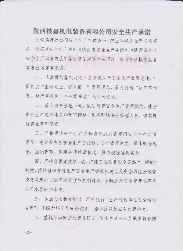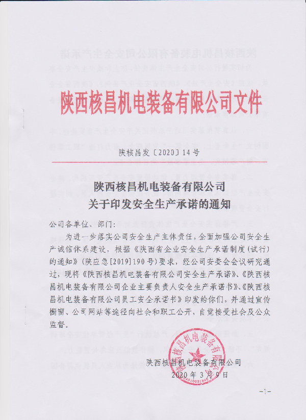 陜西核昌機電裝備有限公司關(guān)于印發(fā)安全生產(chǎn)承諾的通知